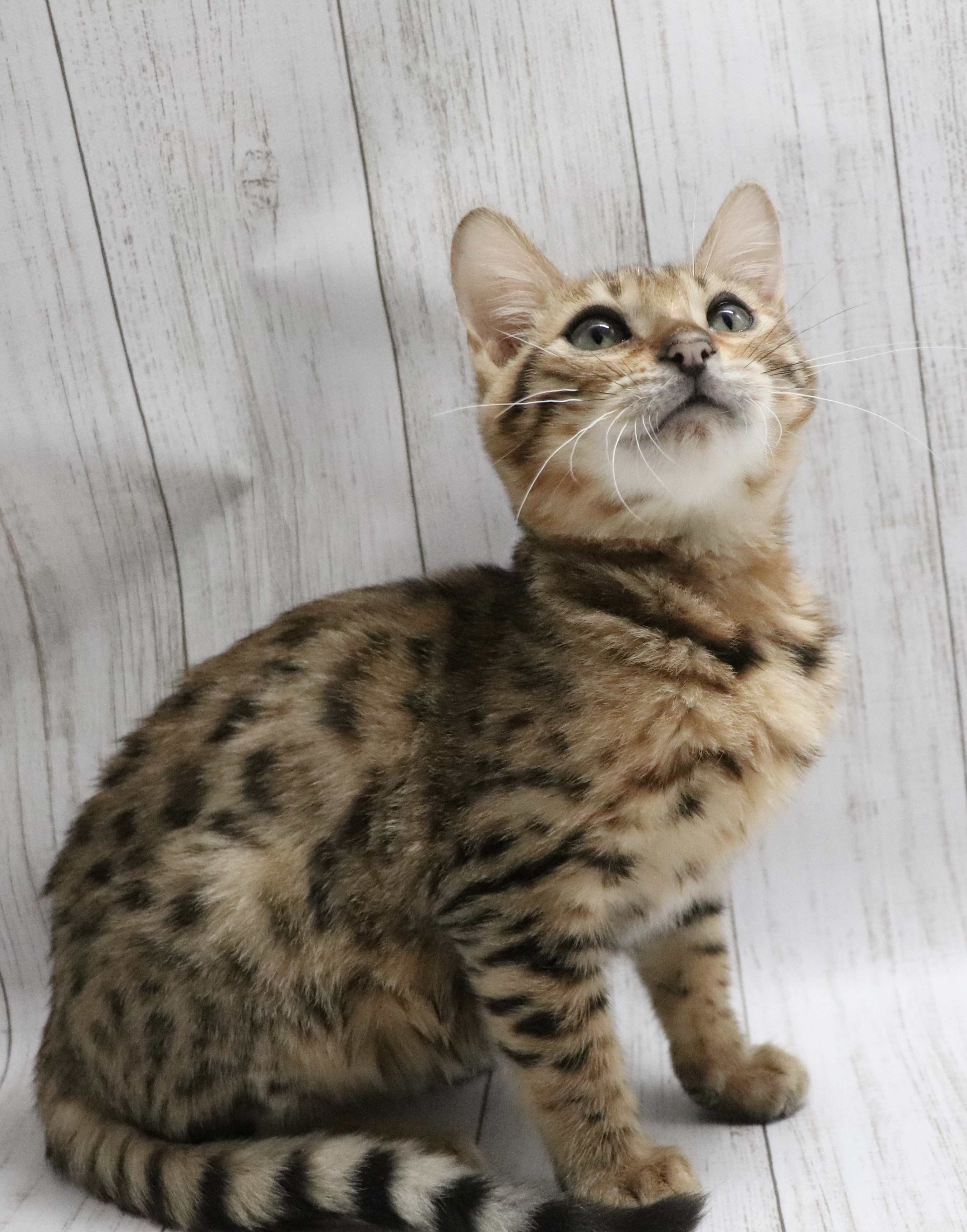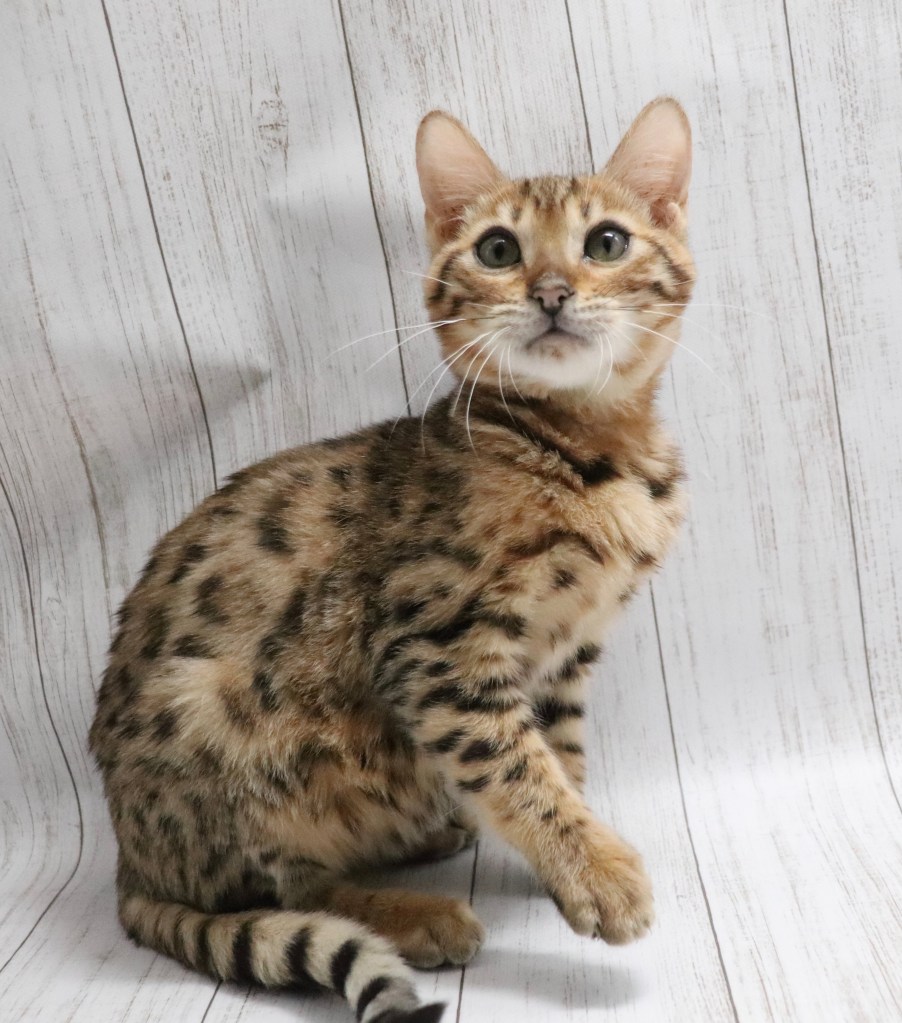 ベンガルの特徴のベルベットのような毛の手触りです。ふわふわした毛がとても魅力的です。スポットのグラデーションもとてもきれいですよ。
